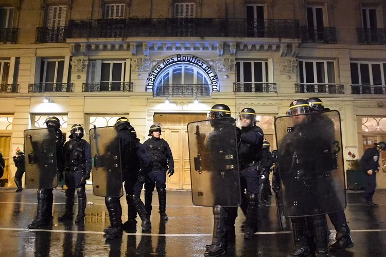 Hàng chục người biểu tình vây quanh nhà hát Les Bouffes du Nord, nơi Tổng thống Pháp Emmanuel Macron cùng phu nhân Brigitte đến xem kịch.