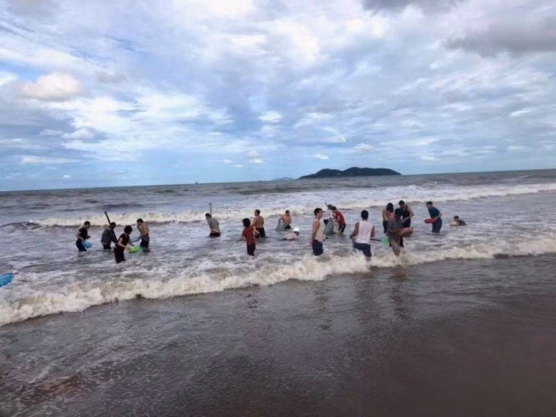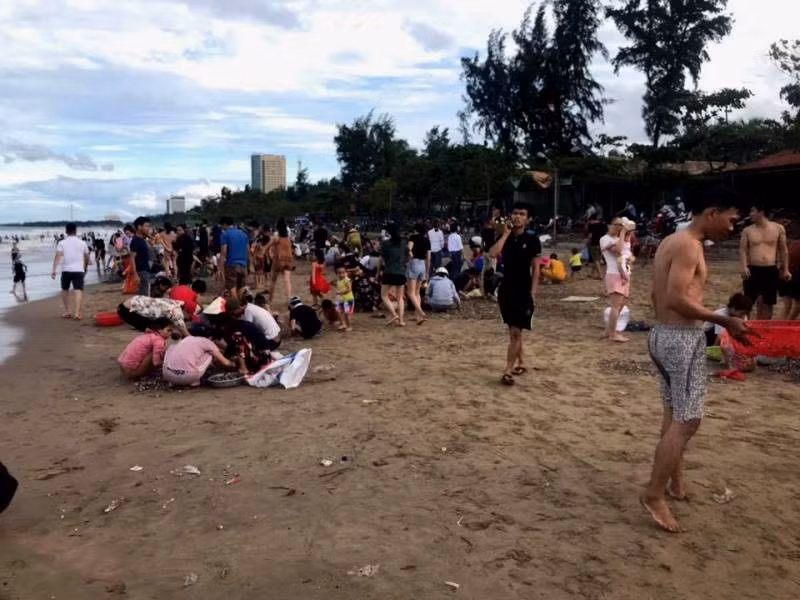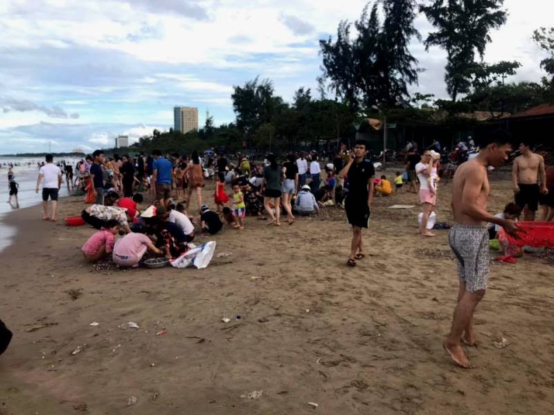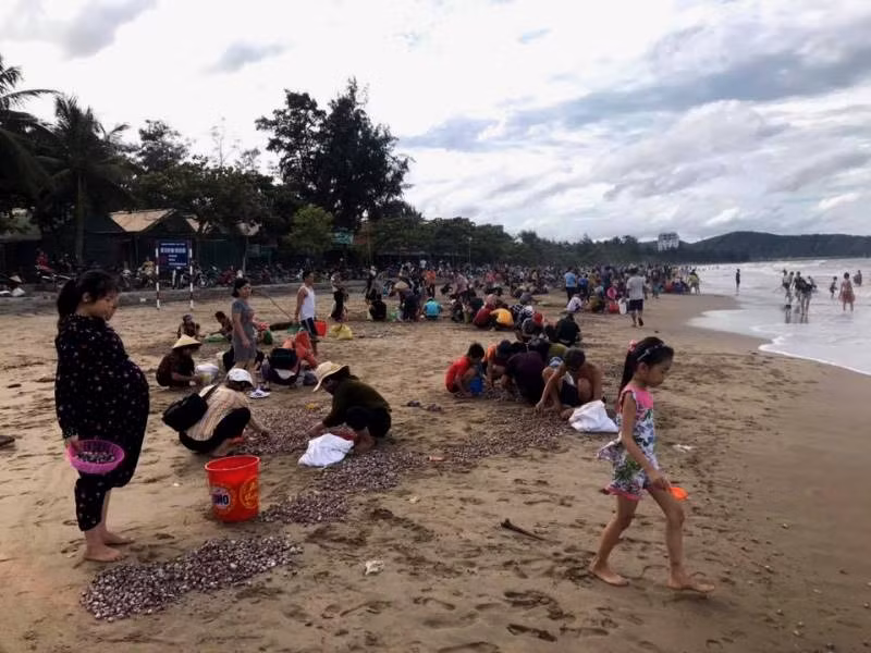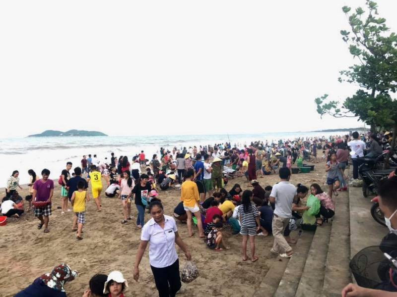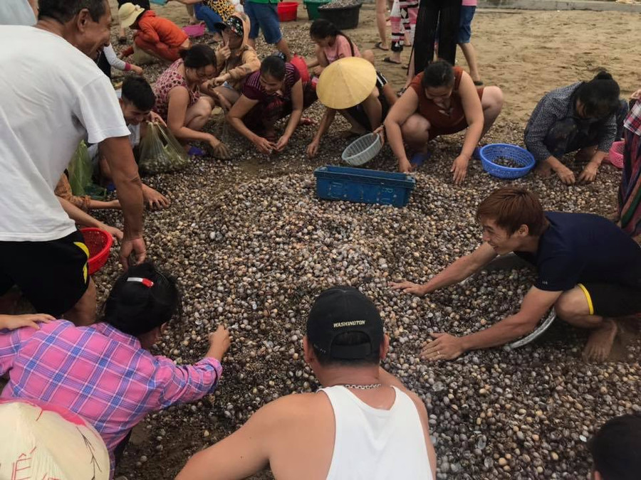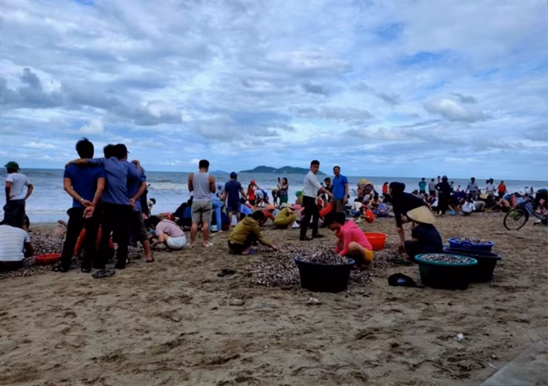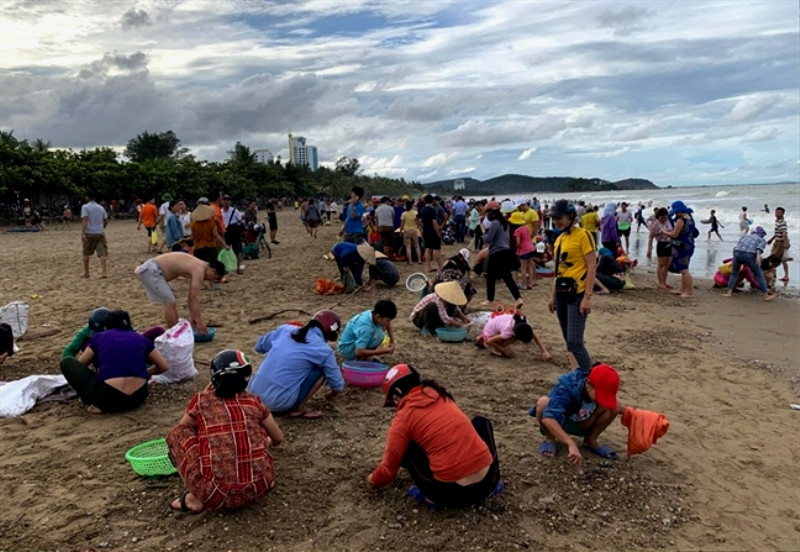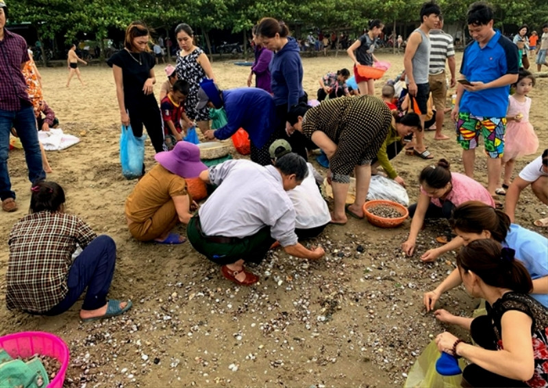 Thông tin nhanh chóng được phát tán, hàng trăm người dân, du khách mang vật dụng ra bãi biển để nhặt mang về chế biến món ăn và ra chợ bán.
