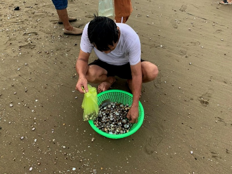 “Khi ra bãi biển, tôi thấy ốc, sò trôi dạt đầy bãi cát nên gọi thêm người nhà ra nhặt từ trưa đến giờ. Nếu ăn không hết thì đem bán”, bà Phan Thị Quỳnh, trú tại phường Nghi Hương, TX Cửa Lò cho hay.
