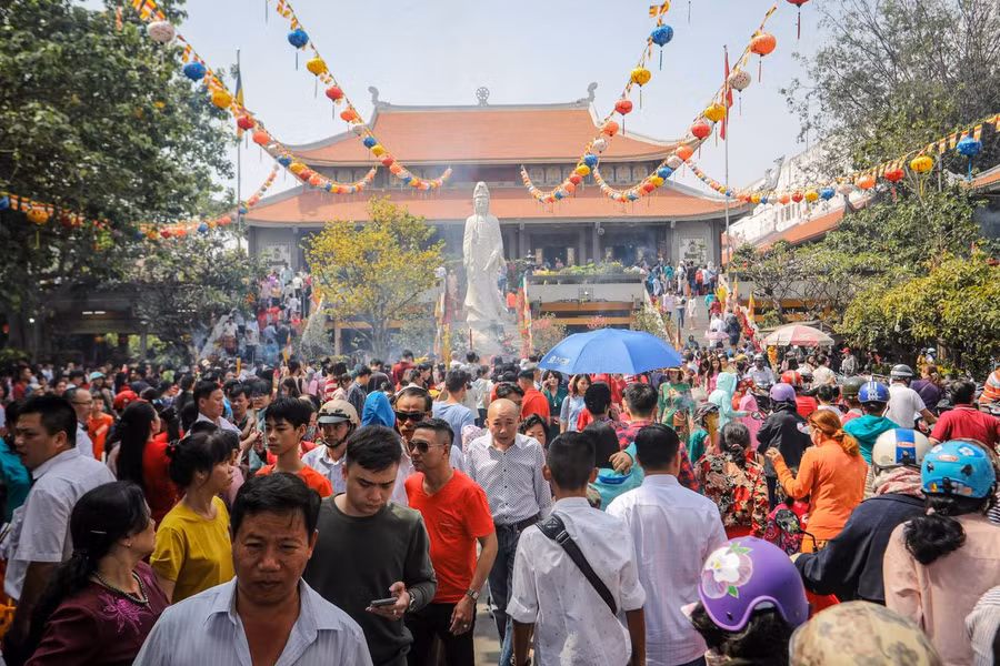 Sáng nay, tại nhiều chùa lớn ở TP HCM như Vĩnh Nghiêm, Xá Lợi (quận 3), Ngọc Hoàng (quận 1), Việt Nam Quốc Tự (quận 10)... đều chật kín người vãn cảnh, cầu may mắn.