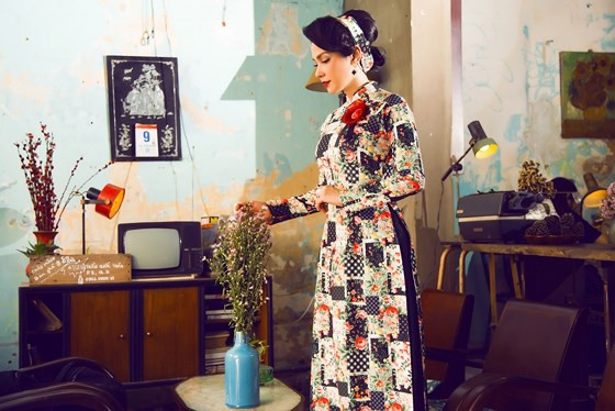 Việt Trinh tỏ ra rất thích thú với những chiếc áo dài họa tiết bắt mắt của NTK Minh Châu và tự tin dù mình không có hình thể chuẩn như người mẫu nhưng khi mặc vẫn tôn được vóc dáng.