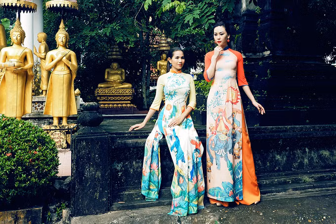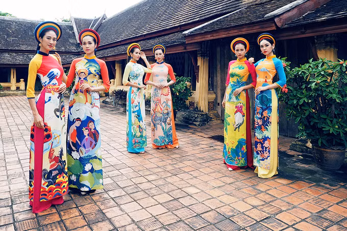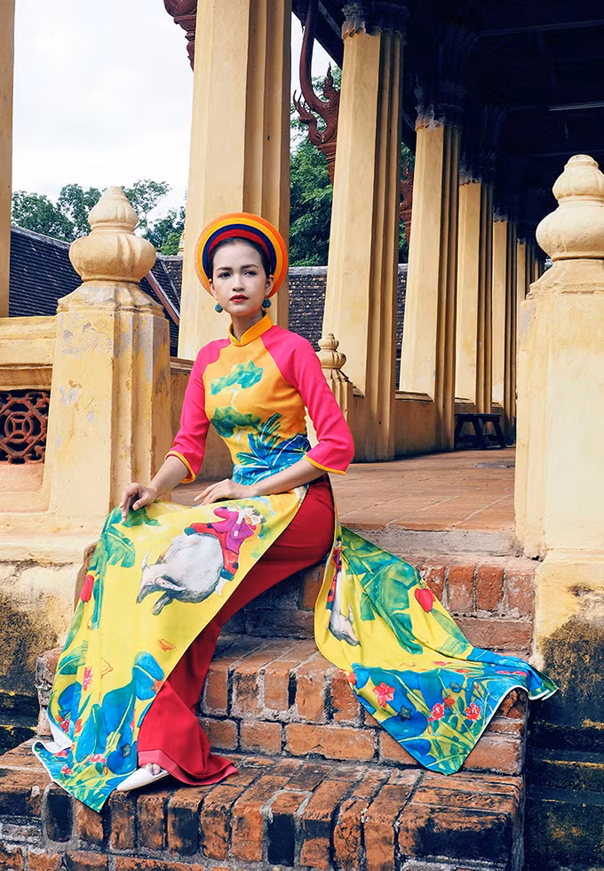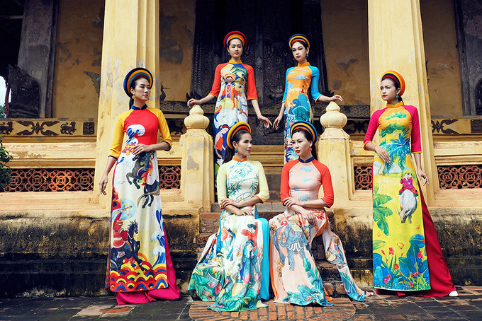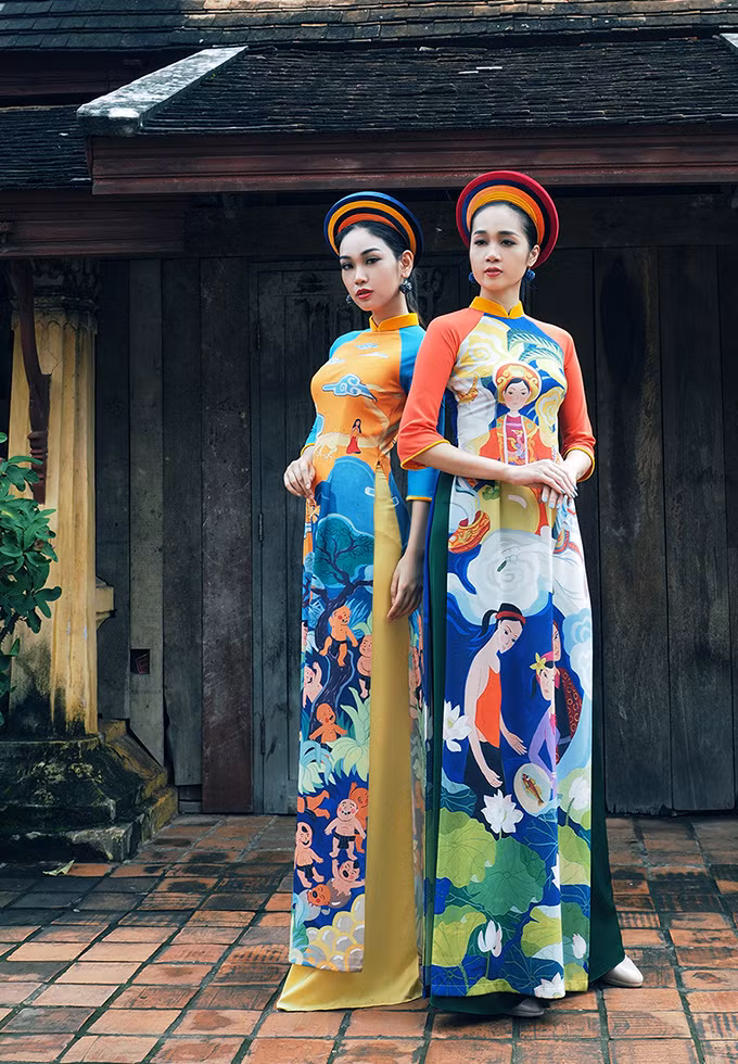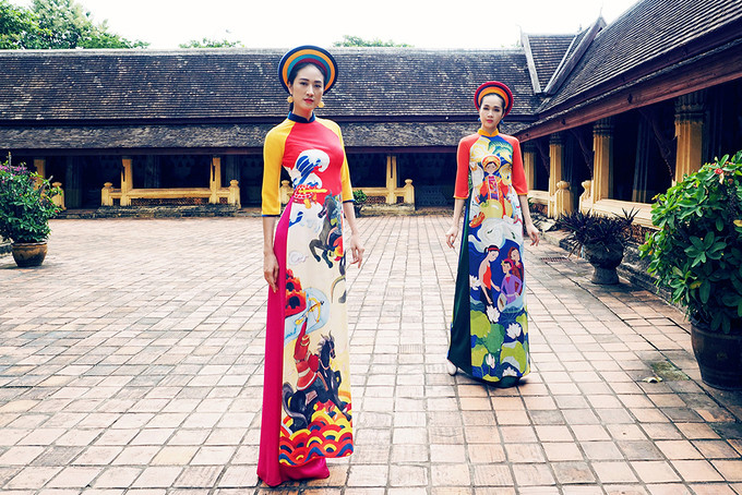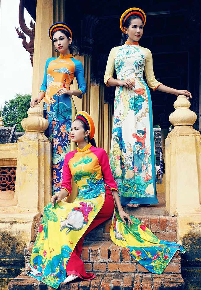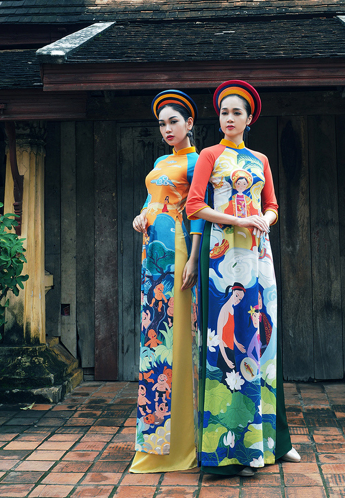 Nhà thiết kế trung thành với kiểu dáng áo dài truyền thống, sử dụng kỹ thuật in chuyển nhiệt.