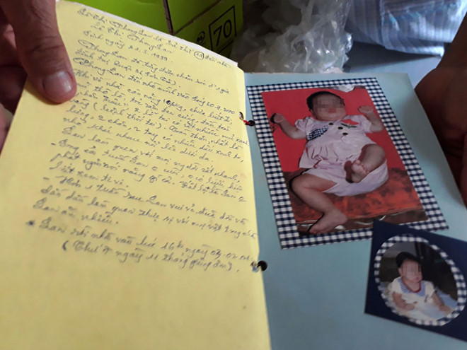 Dòng nhật ký cùng bức ảnh kỷ niệm của bé P.L đã sang Mỹ sống với ba mẹ nuôi. ẢNH: HOÀNG SƠN