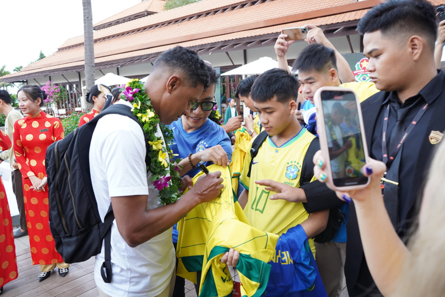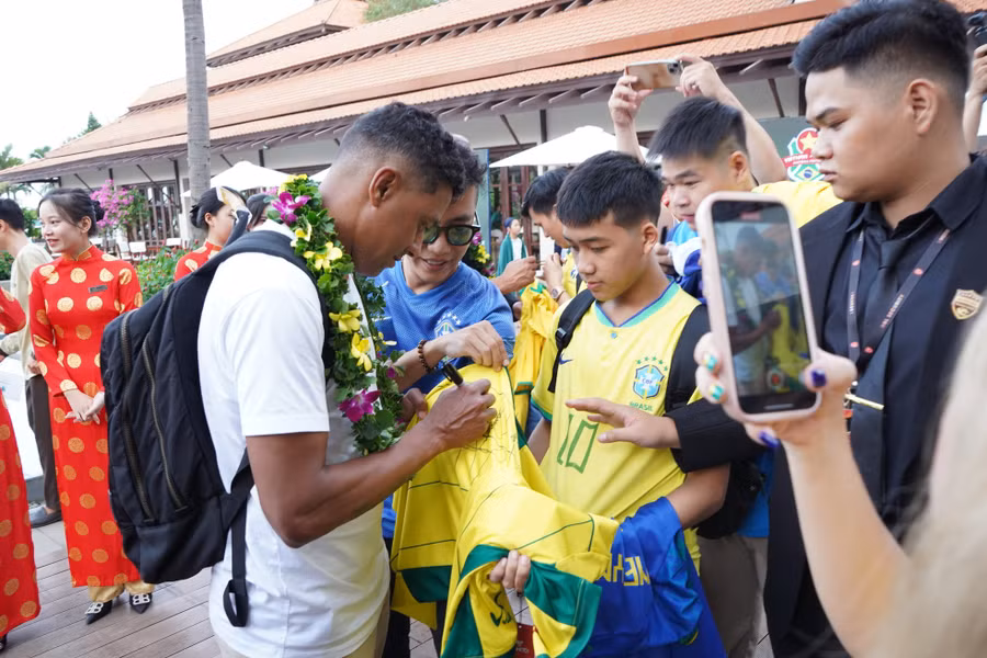 | Cầu thủ Edmilson trong vòng vây người hâm mộ. Dàn cầu thủ và huấn luyện viện cũng sẽ tham gia các hoạt động khác như khánh thành Học viện bóng đá Brazil, lễ hội biển, giải bóng đá trẻ quốc tế… |