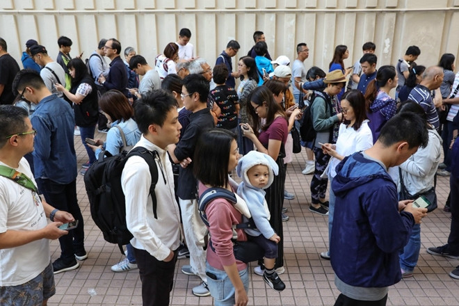 Người Hong Kong xếp hàng dài bên ngoài điểm bỏ phiếu. Ảnh: SCMP