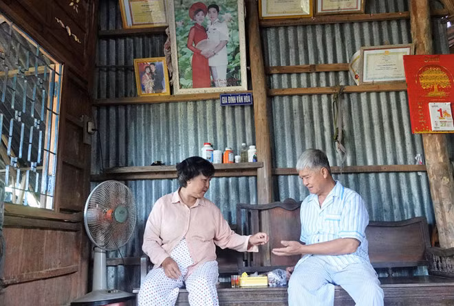 Căn nhà ông bà dựng từ năm 1997, sau cơn bão số 5 Linda. Hơn 20 năm nên kèo cột nhà, mối mọt ăn sạch trơn. Mái lá, cứ 2 năm phải lợp lại nhưng ngày mưa vẫn dột nước nên phải kéo thêm tấm ni lông che trên đỉnh giường. Trong nhà, đáng tiền nhất là chiếc tủ lạnh Sanyo 180 lít nên ông bà kê hẳn lên ghế, lót giẻ vào tay cầm cánh tủ. “Năm trước đi trực ngoài biển mấy tháng trời, em Vẹn dành dụm tiền biển về mua cho cha mẹ. Tiêu chuẩn sữa tươi dành cho bộ đội tàu, nó cũng không dám uống, gửi về quê”, ông bà khoe vậy với tôi, và cười hiền: “Cả nhà, từ giường tủ bàn ghế toàn đồ cụ nội để lại. Mình tuy nghèo nhưng con cái hiếu thảo, là quý rồi”.