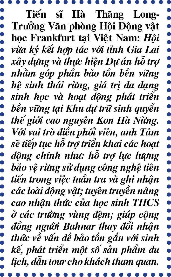Với vai trò điều phối viên Hội Động vật học Frankfurt tại Việt Nam, Thạc sĩ Nguyễn Ái Tâm còn có những đóng góp tích cực trong công tác bảo tồn, bảo vệ đa dạng sinh học ở Vườn Quốc gia Kon Ka Kinh. Song “người rừng” này không hề đơn độc nhờ có công nghệ số. Anh cho hay, nhằm hỗ trợ lực lượng bảo vệ rừng trong công tác tuần tra, Hội Động vật học Frankfurt đã tài trợ smartphone và máy tính cho 9 trạm và 1 đội bảo vệ rừng của Vườn Quốc gia Kon Ka Kinh; ngoài ra còn hỗ trợ kinh phí 3 triệu đồng/trạm/tháng.