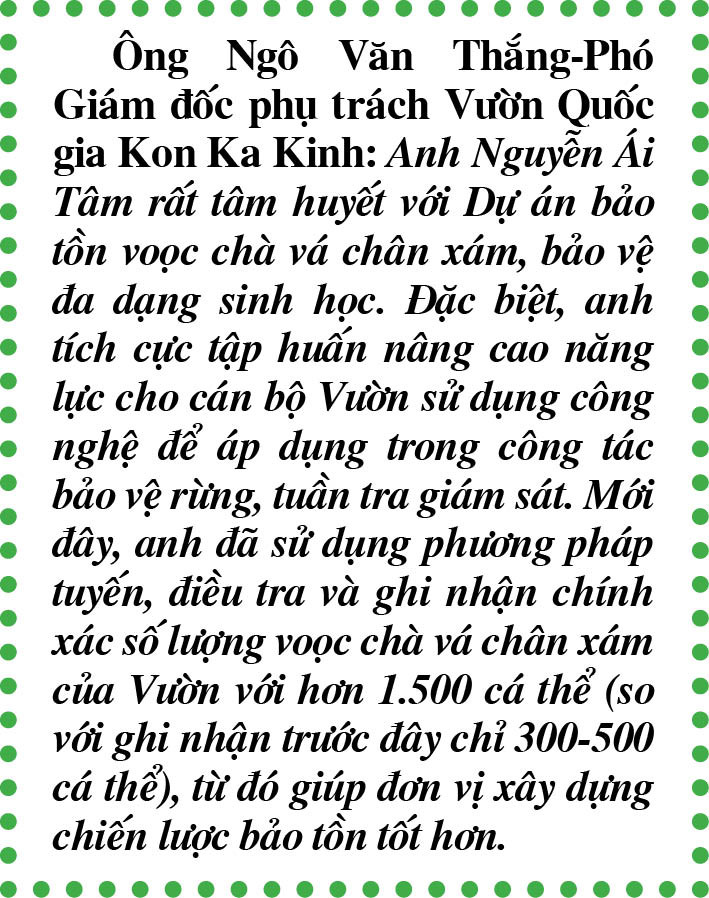 Chừng ấy việc dường như chưa đủ khiến anh Tâm bận rộn. Anh còn tham gia với cán bộ Vườn len lỏi khắp các buôn làng vùng đệm để tuyên truyền nâng cao nhận thức cộng đồng, ngăn ngừa tình trạng phá rừng làm rẫy, ảnh hưởng đến môi trường sống của quần thể voọc chà vá chân xám; xây dựng bài giảng, chương trình ngoại khóa giúp các em học sinh hiểu biết về lợi ích của rừng cũng như những hệ lụy của việc tác động tiêu cực đến môi trường, hệ sinh thái rừng đối với đời sống con người trong tương lai.