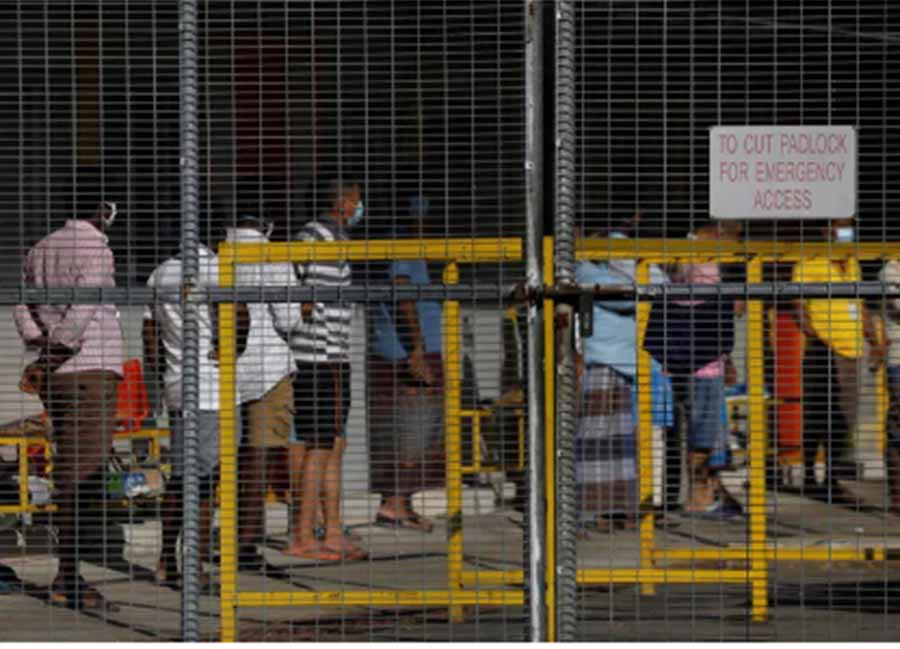Lao động nhập cư xếp hàng nhận bữa sáng hôm 21-4 tại khu vực cách ly ở Singapore, nơi đang có số ca nhiễm tăng mạnh Ảnh: Reuters