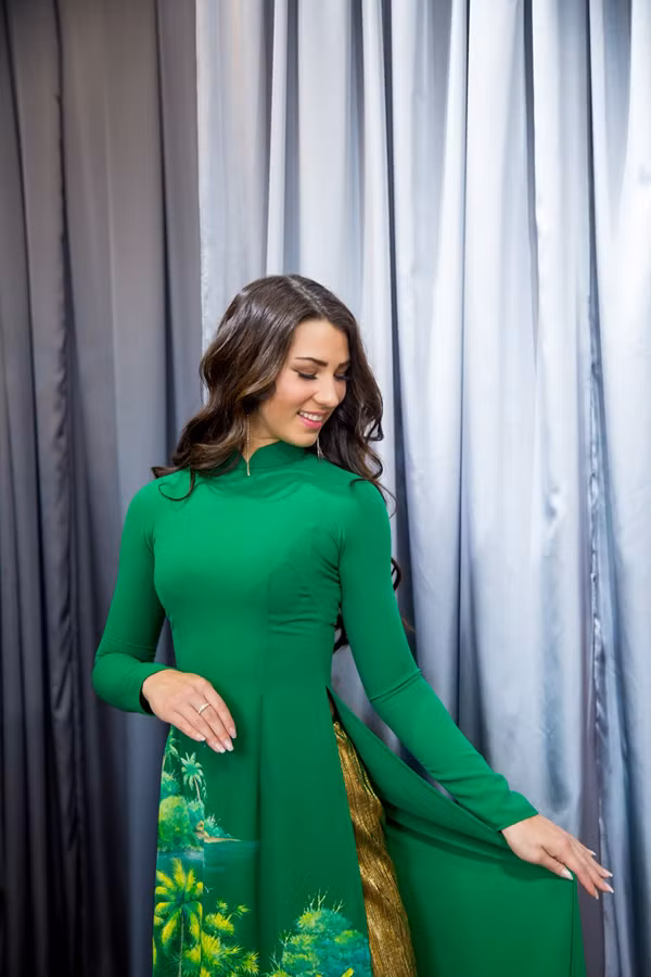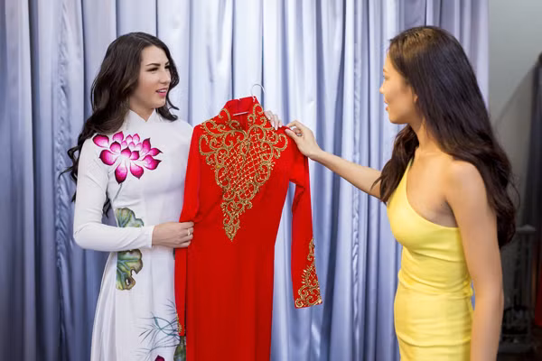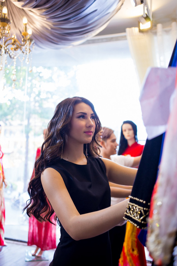 Người đẹp thích thú khi được diện áo dài truyền thống của Việt Nam