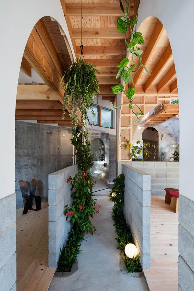 Không gian tầng 1 còn thêm chức năng là một khu vườn nhỏ đầy cây xanh.