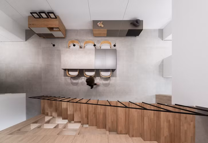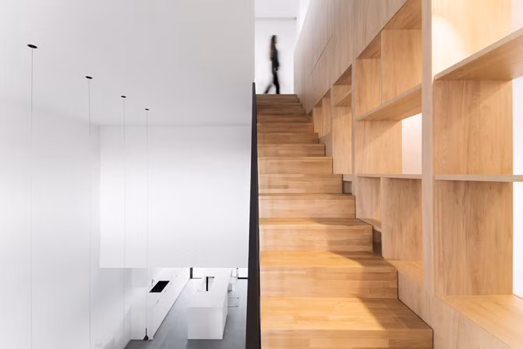 Cầu thang gỗ ngập ánh nắng.
