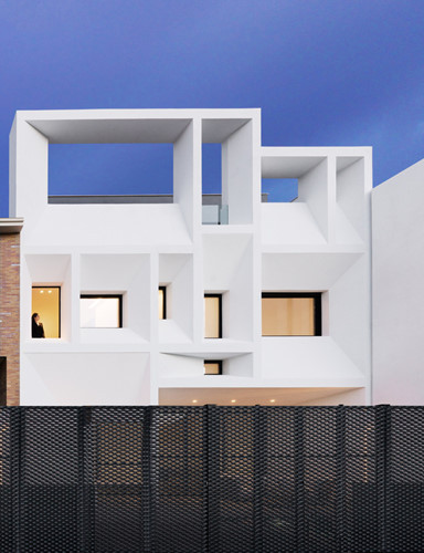 Thiết kế hàng loạt cửa sổ kích thước lớn, nhỏ khác nhau ngoài mặt tiền giúp ngôi nhà 3 tầng có khả năng làm chệch hướng ánh sáng mặt trời.