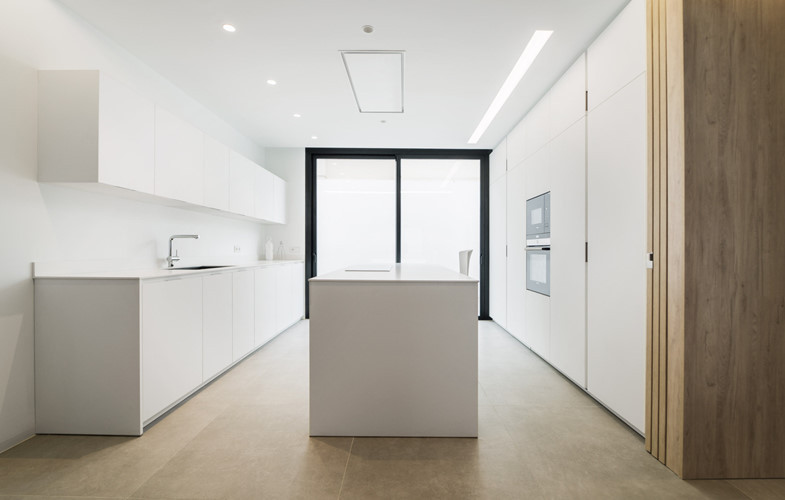 Phòng bếp sang trọng, tinh tế với gam màu trắng muốt.