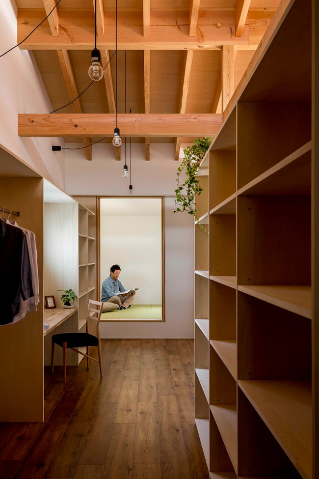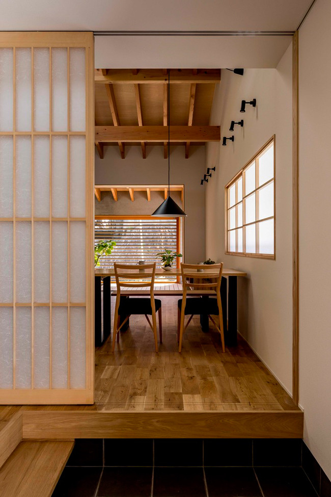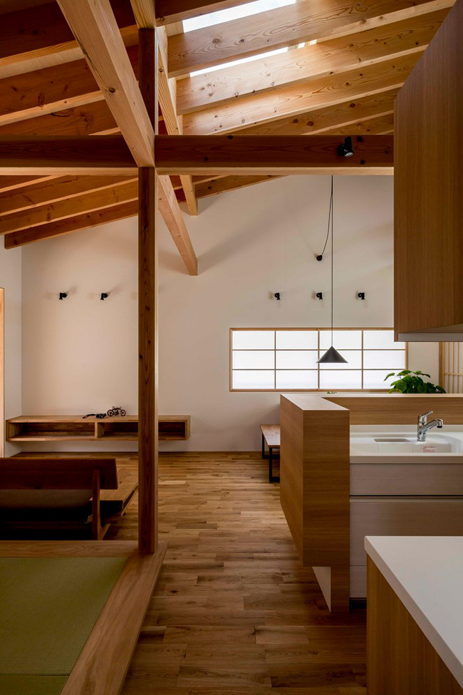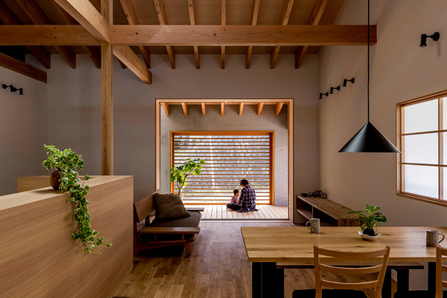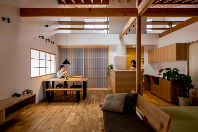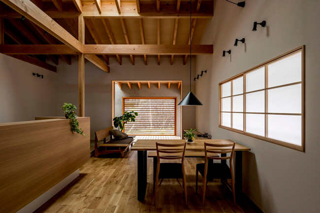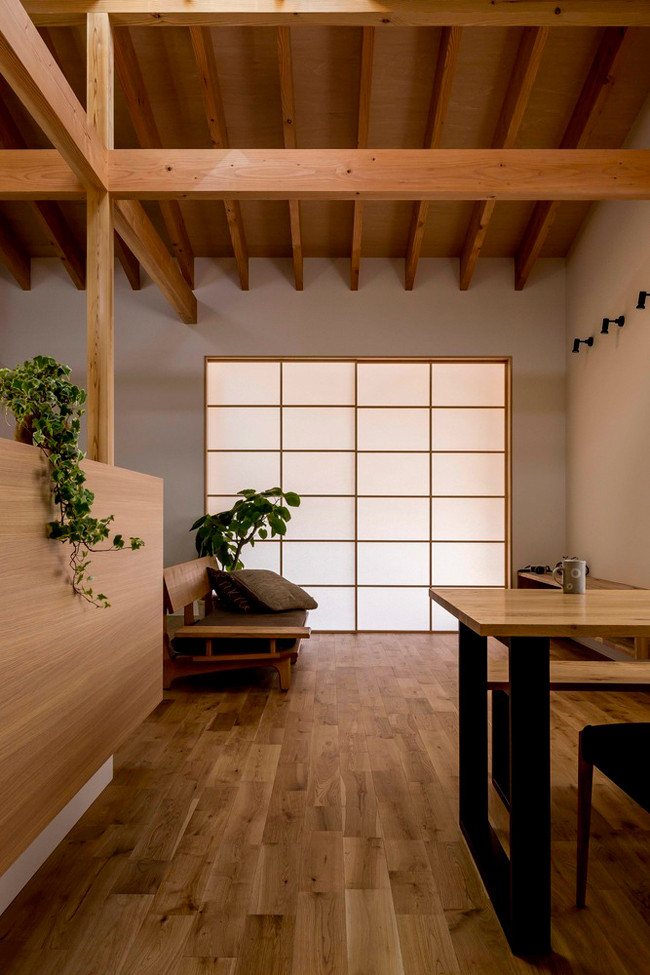 Kiến trúc sư Nhật đã tối giản tường ngăn để tận dụng không gian tốt nhất, tạo nên tổng thể hài hòa và hiện đại cho ngôi nhà gỗ với mái nhà lớn độc đáo.