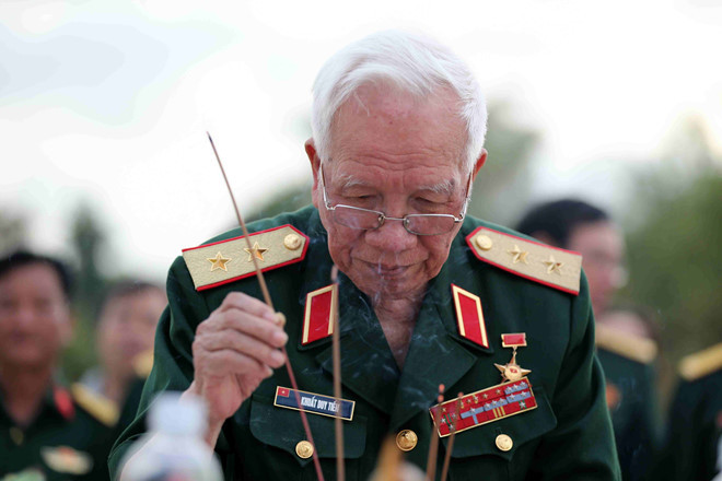 Trung tướng Khuất Duy Tiến thắp hương tại nhà bia di tích tại 2 điểm cao 1015 (Charlie), 1049 (Delta) ở xã Rờ Kơi (H.Sa Thầy, Kon Tum) tưởng nhớ các đồng đội đã hy sinh. Ảnh: Độc Lập