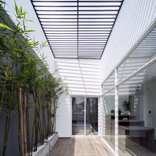 Hệ lam ngang phía trước như một lớp vỏ mềm mại bảo vệ cho công trình và không gian bên trong.
