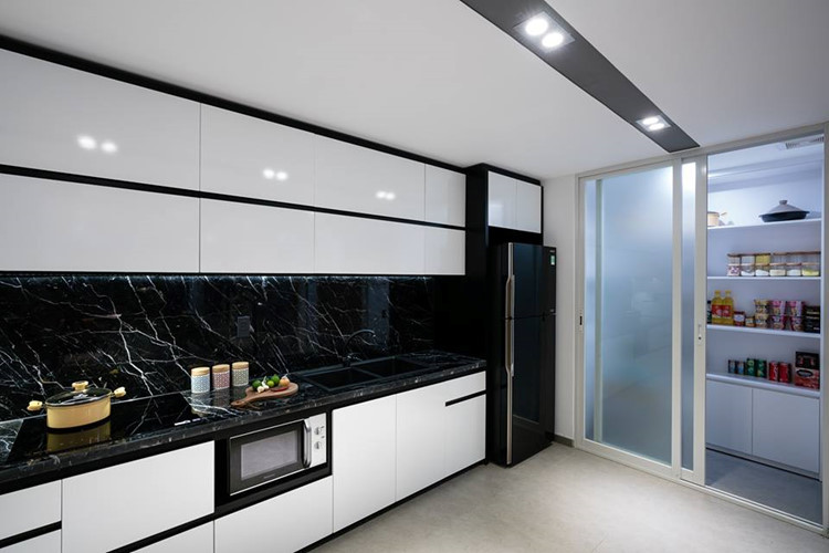 Nhà bếp sang trọng, hiện đại với hai gam màu trắng đen.