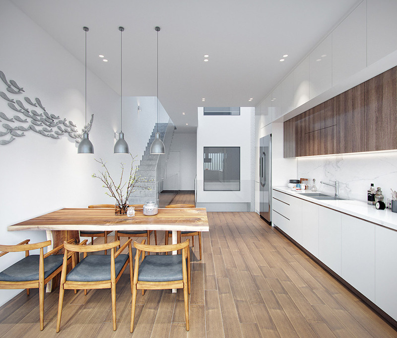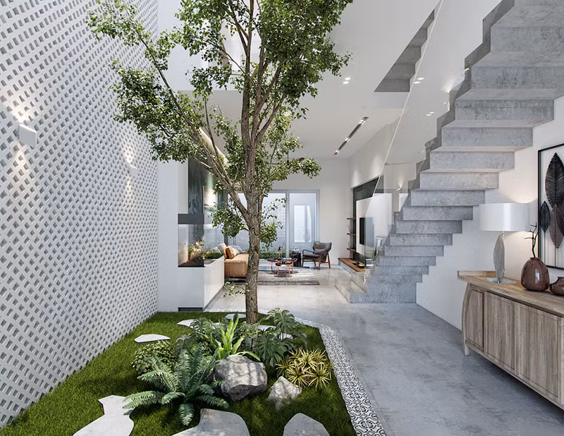 Ngôi nhà xây dựng theo lối kiến trúc hiện đại với giếng trời, nội thất và tường trang trí màu xanh, mang lại vẻ đẹp thân thiện, gần gũi.