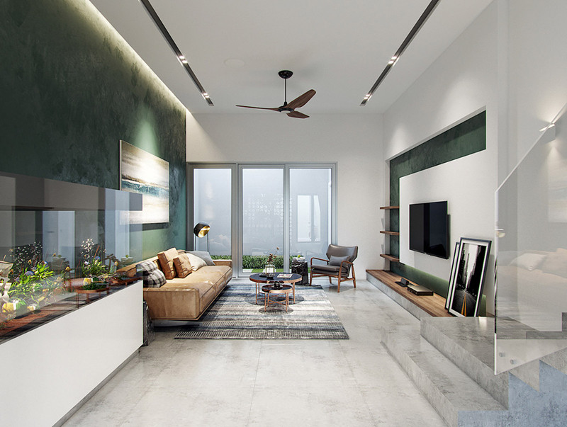 Với lối kiến trúc mang tính chuyển tiếp, các bức tường được trang trí màu xanh ngọc bích để bổ sung màu xanh cho mảnh vườn ở giếng trời. Một chiếc đèn sàn độc đáo đứng cạnh ghế sofa màu nâu, bổ sung cho tông màu gỗ tự nhiên trong phòng.