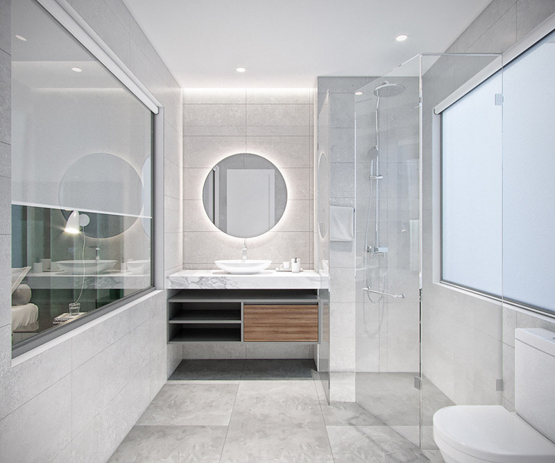 Trong khi kính lại là chất liệu chủ đạo trong phòng tắm, tạo sự thoáng đãng.