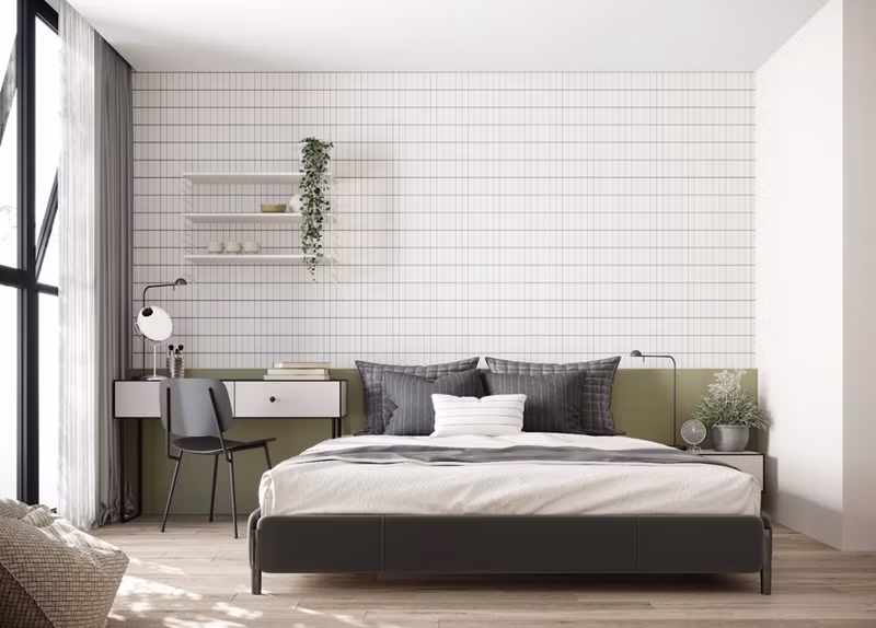 Bên trong phòng ngủ tối giản, đầu giường trang trí bằng màu xanh lá tạo sự khác biệt.
