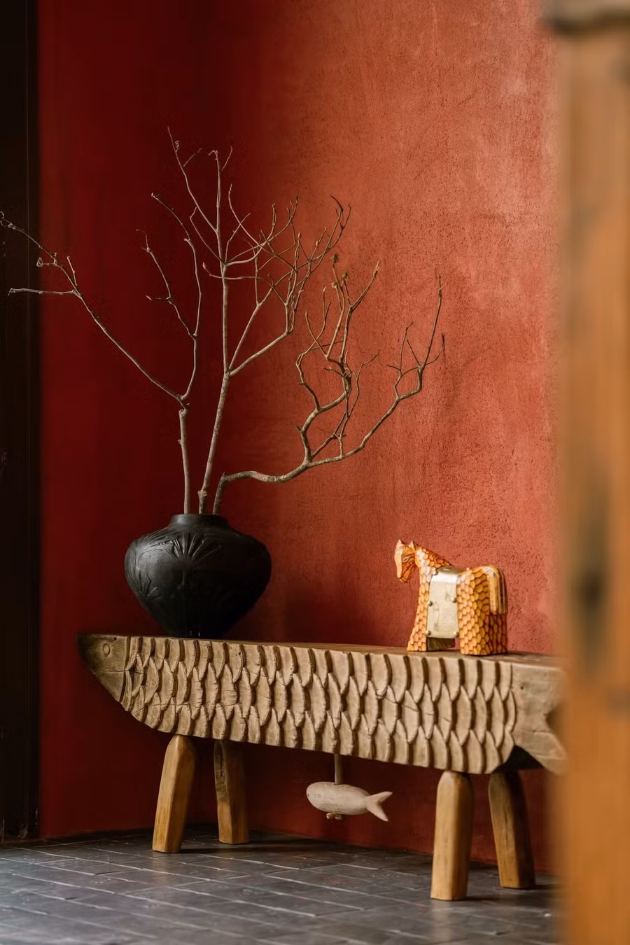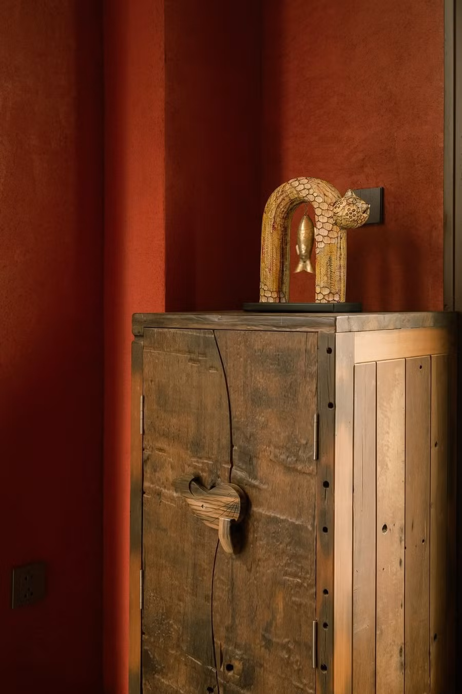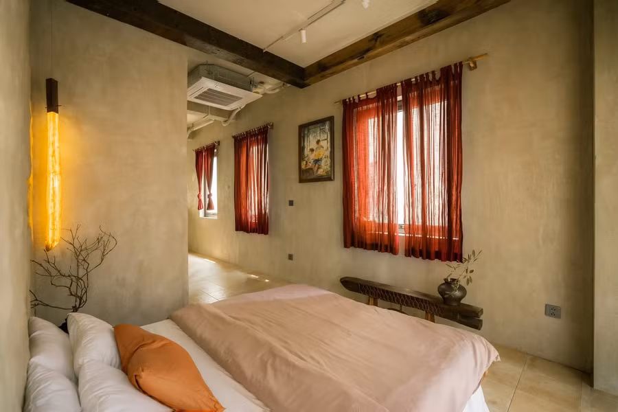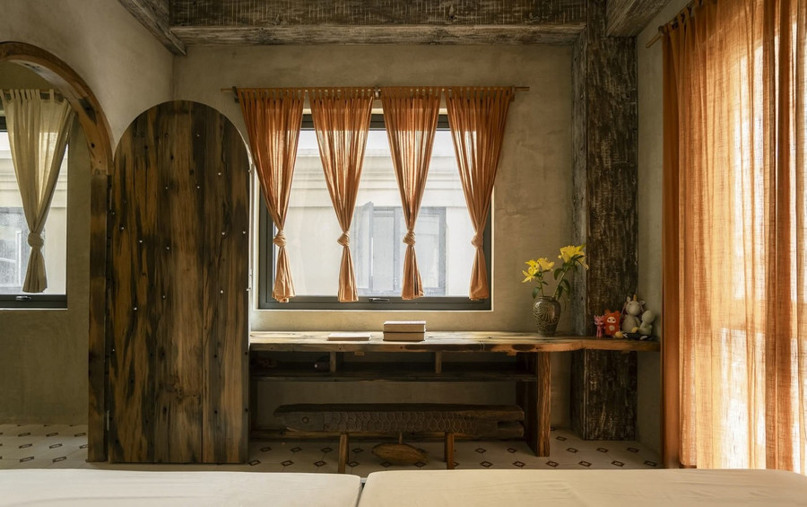 Không gian với tính cách thô mộc và những mảng màu mạnh cá tính. Nội thất gỗ Táu tái sinh từ thuyền cũ và đầy ắp đồ thủ công, vải lanh, đèn giấy,... biến nơi này thành một "hang động" đầy cảm hứng.