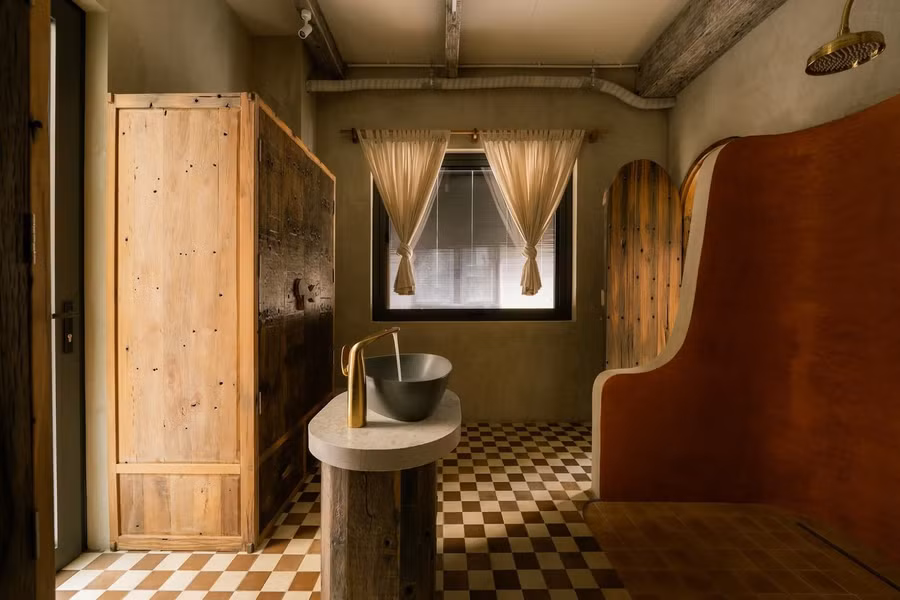 Tinh thần thô mộc không chỉ được thể hiện qua nội thất gỗ mà còn hiện diện qua tường hiệu ứng, vật liệu gạch, đá, đường nét bất đối xứng, bất toàn khắp mọi ngóc ngách.