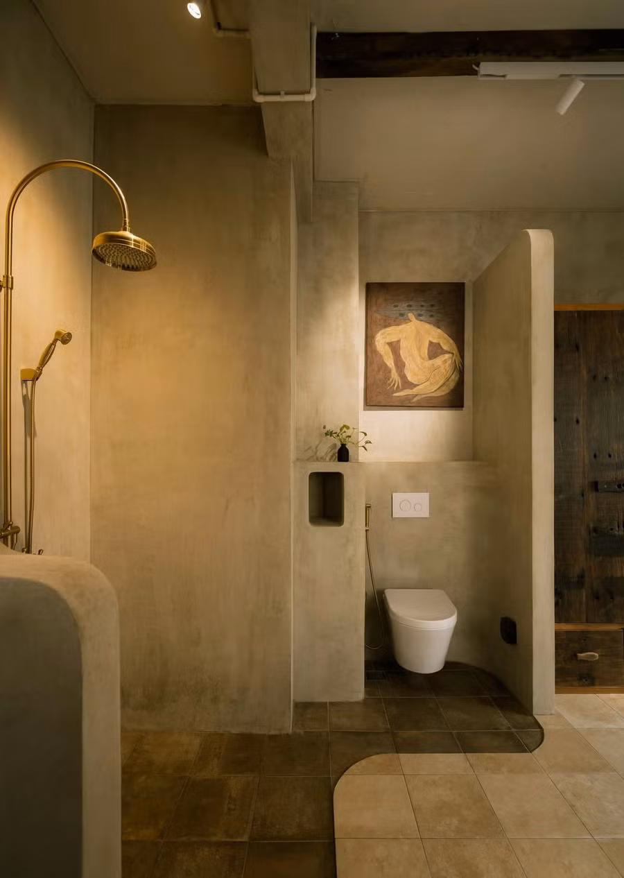 Các phòng tắm được phân chia khô ướt rõ ràng, giản dị nhưng đầy đủ tiện nghi. Các phòng ngủ cũng thống nhất với tinh thần thô mộc và cá tính, tạo nên không gian nghỉ ngơi vừa thú vị vừa thoải mái cho người sử dụng.
