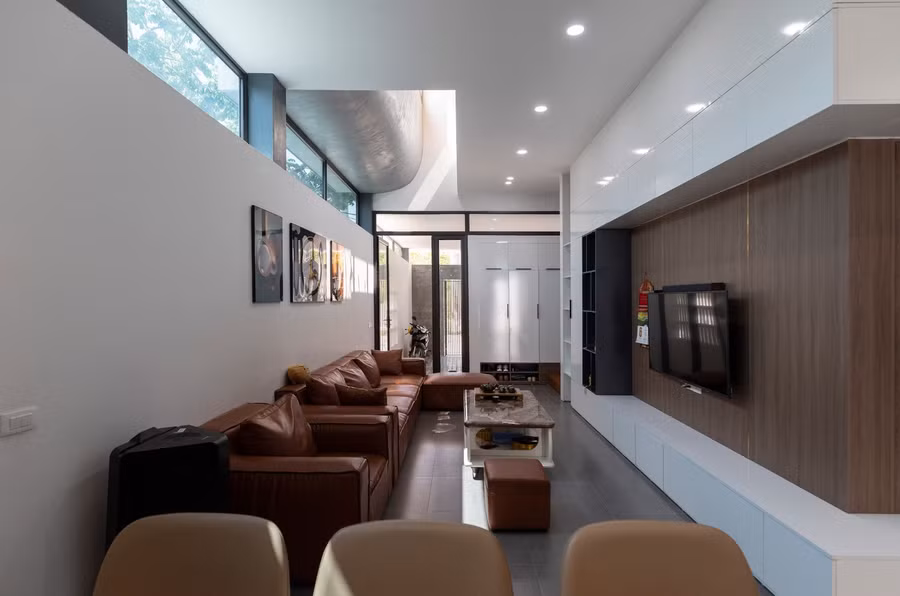 Dự án được thiết kế khá táo bạo khi co cụm khối ở, chừa hai biên khe sáng thông thoáng hai bên và xoay mặt tiền khối nhà về hướng có lợi hơn để thoải mái lấy sáng cho từng ngóc ngách của ngôi nhà.