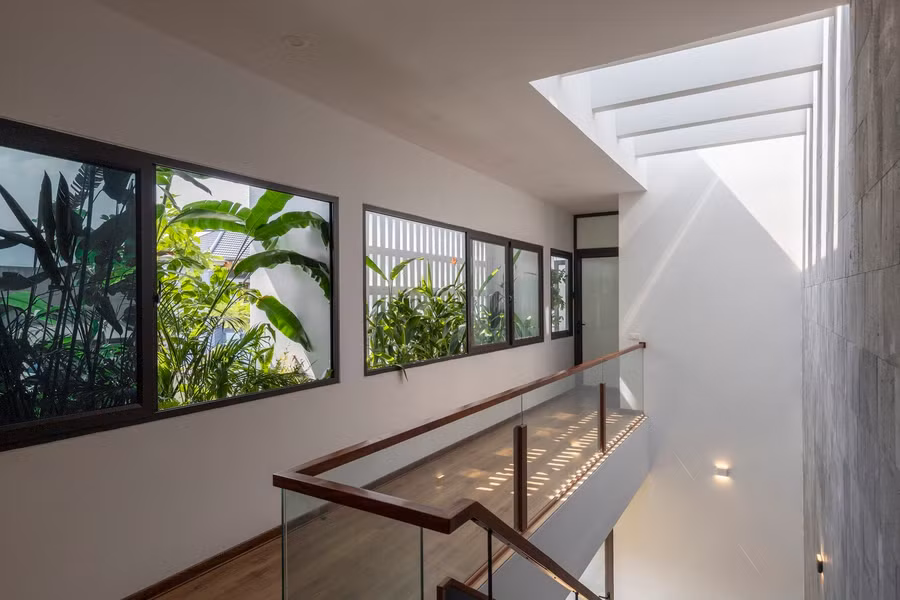 Tầng 2 và tầng 3 thông nhau bằng cầu thang mở, tận dụng tối đa ánh sáng từ giếng trời. Các cửa sổ hành lang tiếp xúc với môi trường được thiết kế tường gạch thông gió và cây xanh giúp giảm nhiệt độ, đảm bảo thông gió bên trong ngôi nhà.