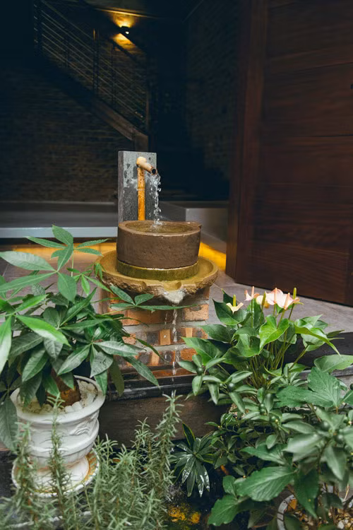 Ngay lối vào là một tiểu cảnh vừa có cây xanh, nước chảy với hình ảnh chiếc cối xay ở các vùng nông thôn.