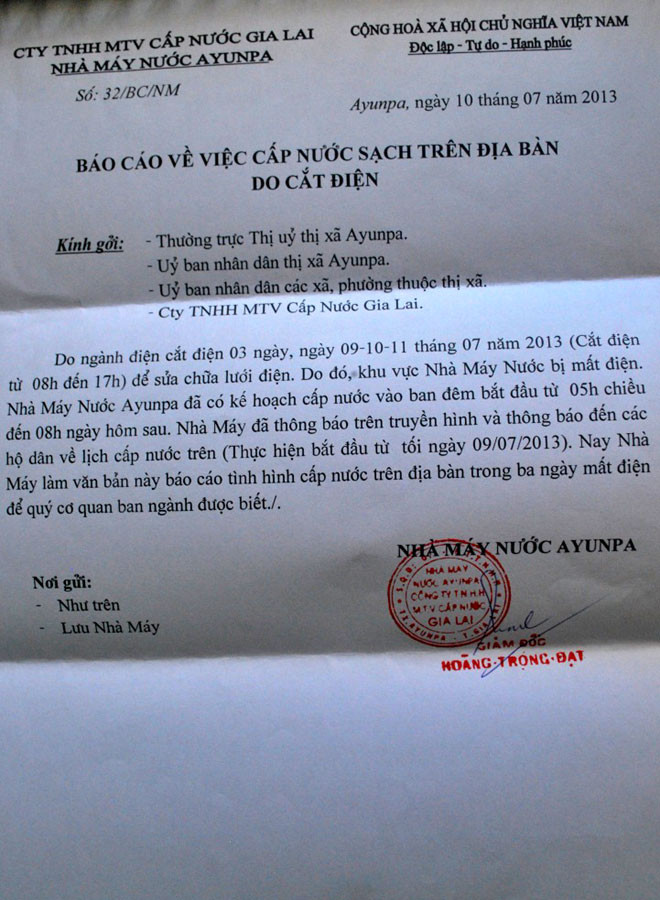 (GLO)- Ông Hoàng Trọng Đạt- Giám đốc Nhà máy Nước Ayun Pa cho biết: Vì ngành điện tạm ngừng cấp điện trong 3 ngày (9-10 và 11-7) để sửa chữa lưới điện mà không thông báo trước.