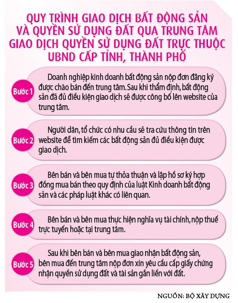 Theo Bộ Xây dựng, Thủ tướng đã giao bộ này phối hợp Bộ Tài nguyên - Môi trường (TN-MT) nghiên cứu lập sàn giao dịch bất động sản (BĐS) và sàn giao dịch quyền sử dụng đất. Quá trình thực hiện chỉ đạo này, Bộ nhận thấy nên tích hợp 2 sàn giao dịch thành trung tâm giao dịch quyền sử dụng đất sẽ giúp quá trình giao dịch và cấp quyền sử dụng đất, nhà ở được tiến hành đồng thời, giảm thủ tục hành chính, giảm thời gian thực hiện.