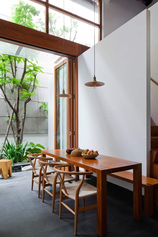 Bàn ăn và bếp được đặt cạnh tiểu cảnh, lấy trọn vẹn nguồn ánh sáng tự nhiên.