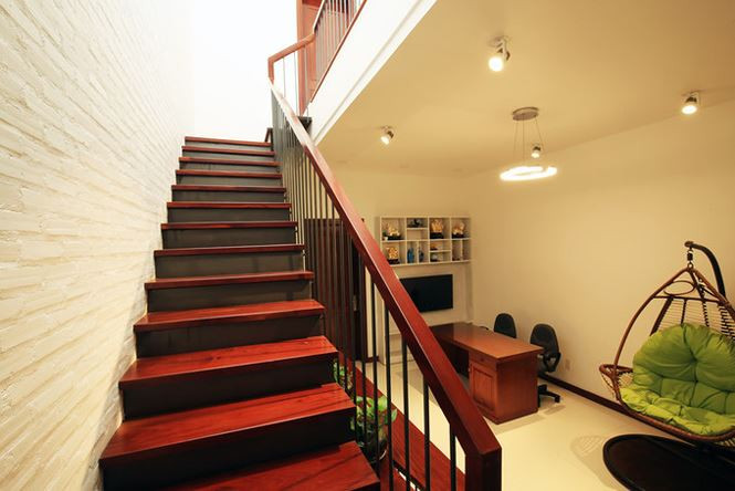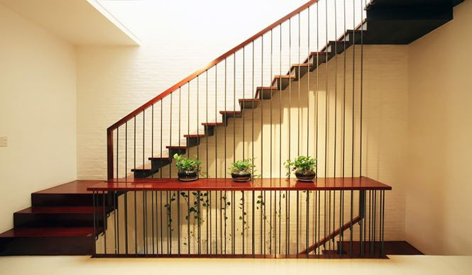 Giếng trời bố trí phía trên cầu thang gỗ.