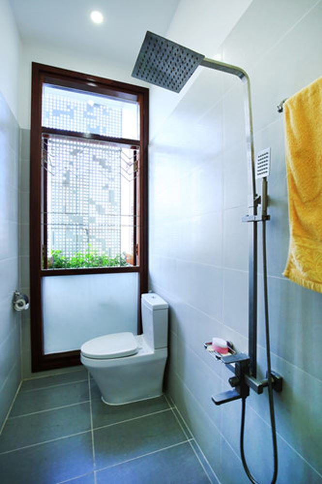 Phòng tắm có cửa sổ lớn để lấy ánh sáng.