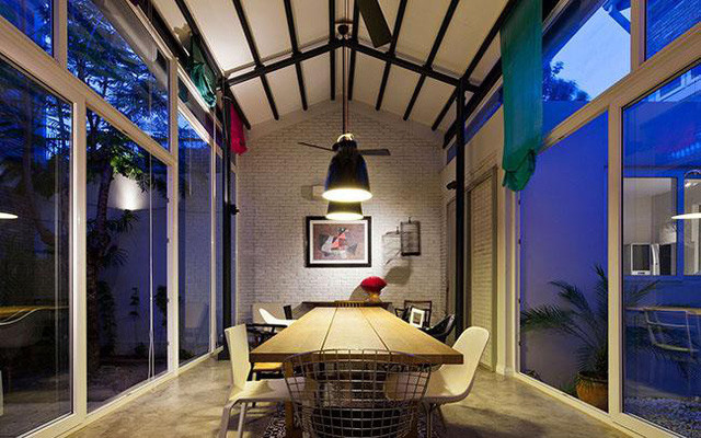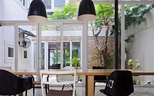 Phòng ăn với 2 bức tường phụ đều bằng kính là không gian trung tâm trong toàn bộ căn nhà. Căn phòng này nằm giữa hai sân trong và giữa hai gian nhà bếp và phòng khách.