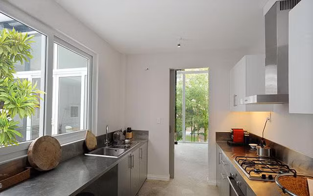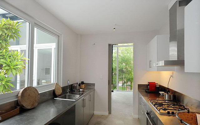 Phòng bếp đơn giản nhưng đầy đủ tiện nghi với 2 phần sân bên hông và đằng sau đảm bảo không khí lưu thông và không thiếu ánh sáng tự nhiên.