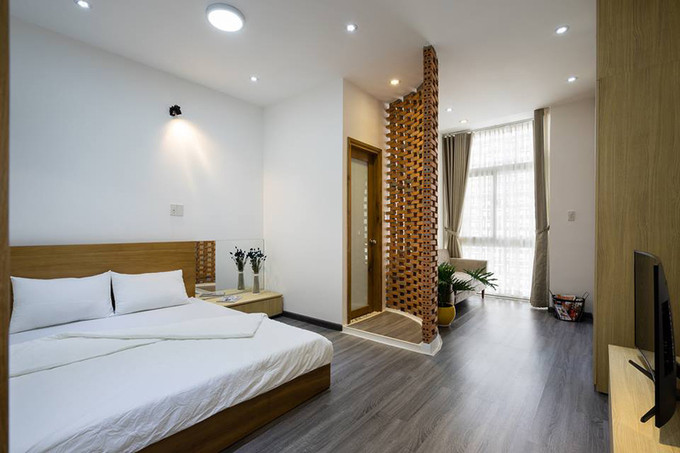 Mỗi căn phòng đều có nét duyên dáng riêng, có thể là đôi đèn màu đỏ nổi bật hay một bức vách gạch lỗ vừa che lối vào WC vừa tạo nền trang trí cho khu đọc sách.