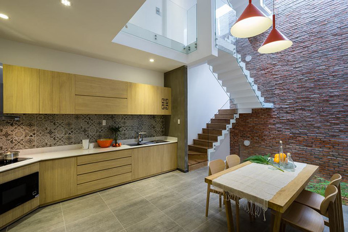 Phần thông tầng giúp phòng ăn trở nên cao, thoáng hơn. Kiến trúc sư cũng tối giản mọi yếu tố trang trí, để nhà đẹp nhờ chính các chi tiết vật liệu.