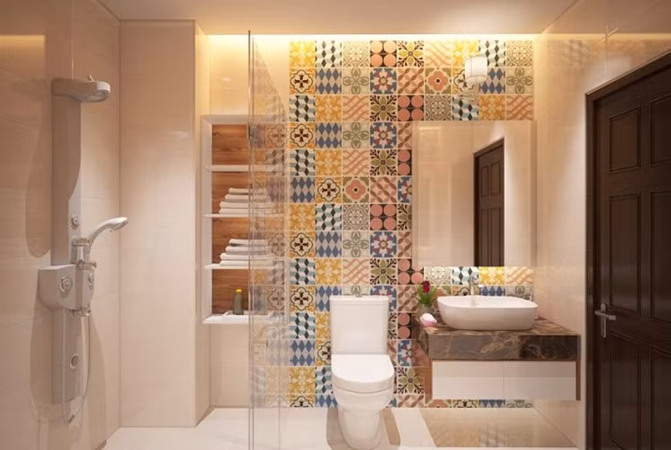 Sau cải tạo, phòng tắm hiện đại, hợp xu thế với trang trí gạch bông phổ biến trong năm 2018.