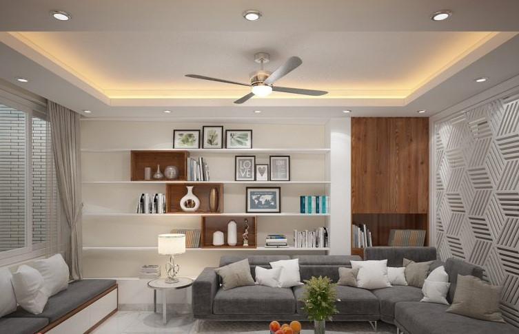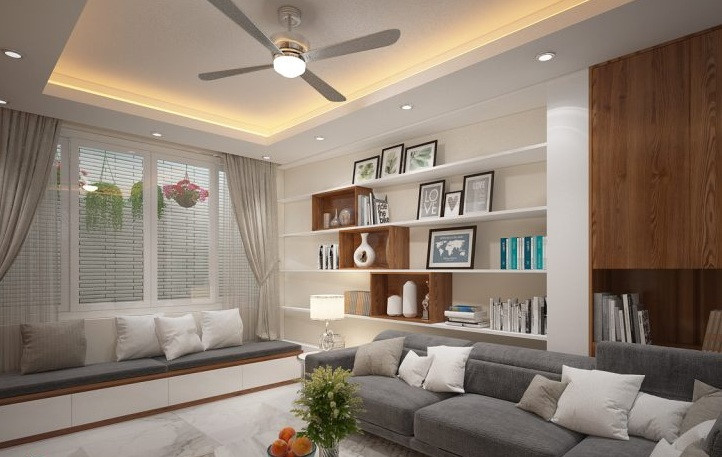 Phòng sinh hoạt chung trang trí đơn giản, lấy kệ sách lớn làm điểm nhấn.