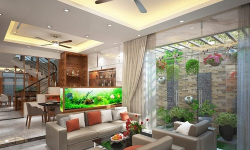 Để tạo không gian thoáng, sang trọng, nhóm kiến trúc sư Song Phát Construction đã kết hợp trần nhà cao với các khung cửa sổ kính.