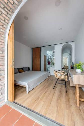 Phòng ngủ chính rộng rãi nối liền với phòng sinh hoạt chung bằng hành lang nhỏ, ban công phòng hướng ra khu dân cư. Những bức tường ngăn cách được thay thế bằng lưới thép ô lục giác, tạo sự thông thoáng cho căn phòng.
