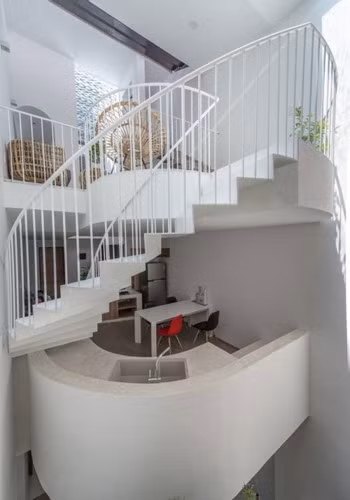 Gầm cầu thang được tận dụng để làm những ô cất đồ, đặt bồn rửa, tiết kiệm không gian một cách tối đa.