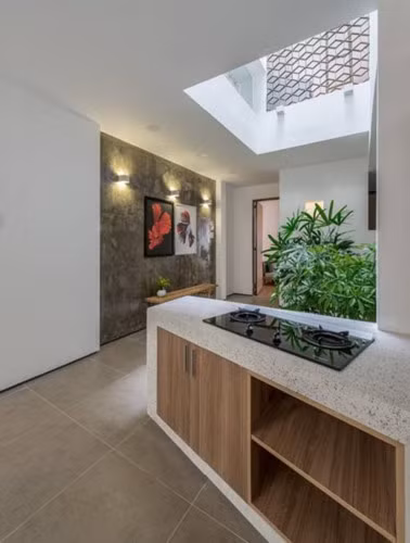 Khoảng giếng trời nhằm tận dụng ánh sáng và thông gió được thiết kế phía lưng nhà.