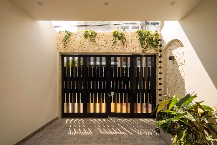 Mặt đứng ngôi nhà là sự kết hợp hài hòa giữa đường cong mềm mại, mảng xanh tự nhiên và vật liệu hiện đại. Dù diện tích mặt tiền nhỏ, nhưng nhờ xử lý khéo léo, công trình vẫn toát lên vẻ thanh thoát, tinh tế và đầy sức sống phù hợp với hình ảnh một homestay đô thị nhẹ nhàng, yên bình.