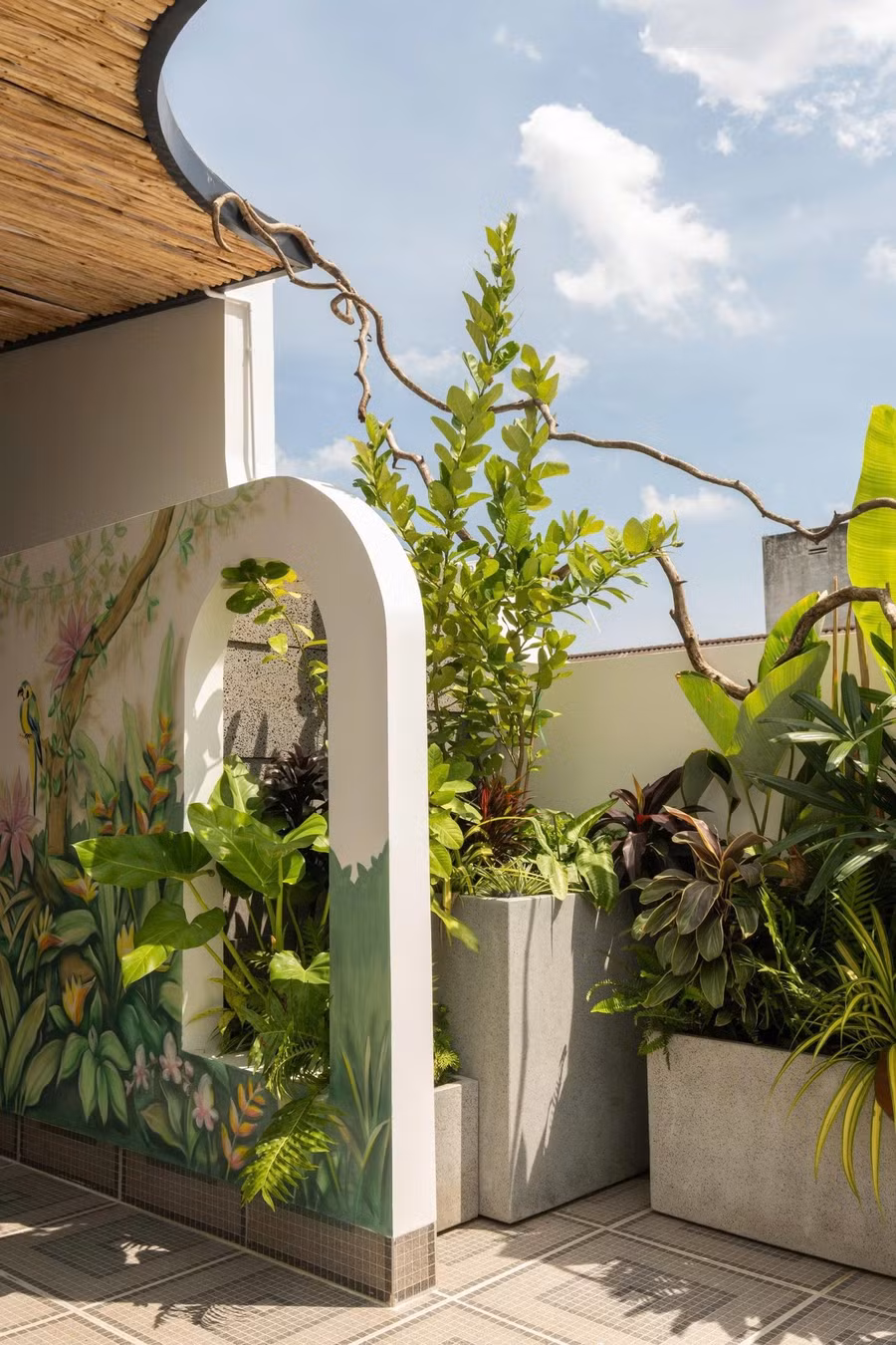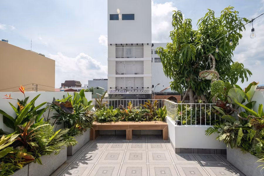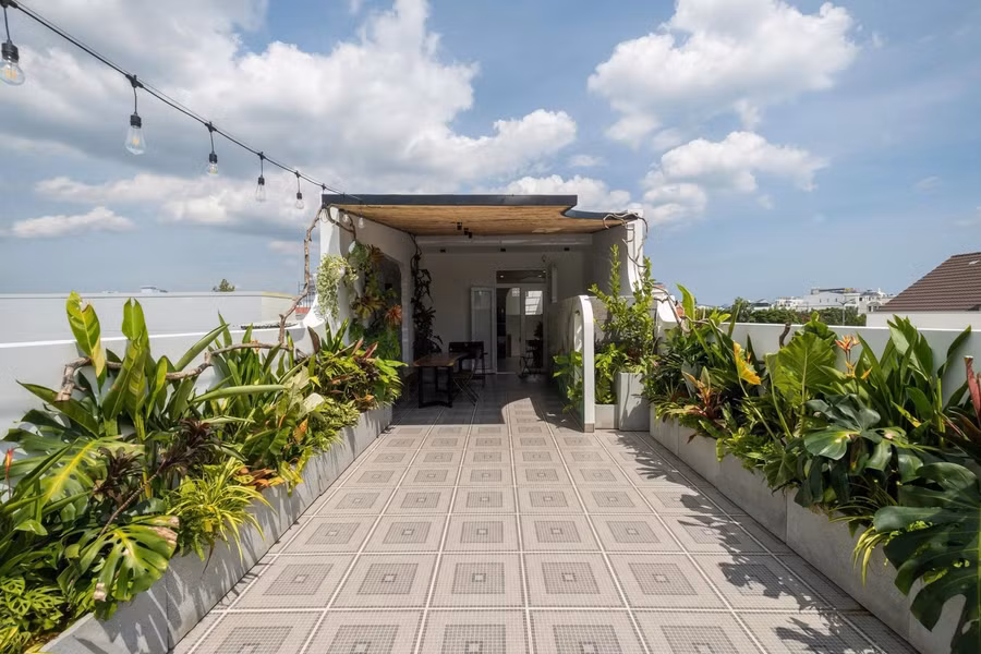 Sân thượng được thiết kế như một khu vườn trên mái, kết hợp khéo léo giữa vật liệu tự nhiên, mảng xanh và ánh sáng.