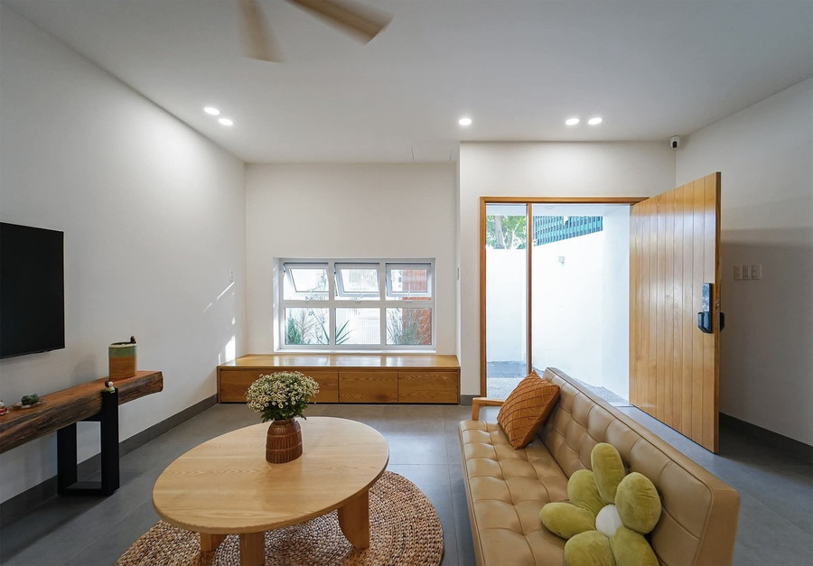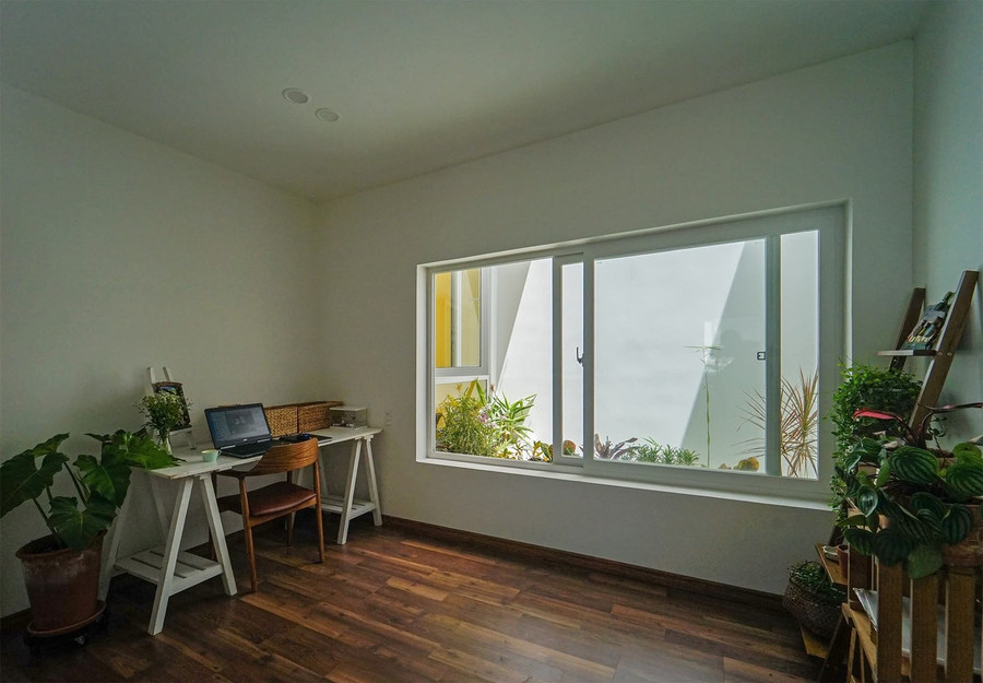 Căn nhà hướng nội nhưng vẫn giữ được sự kết nối với mặt tiền kín đáo được trổ những khoảng trống đan xen.